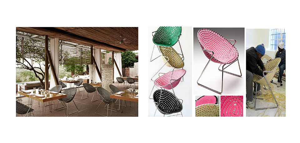 The iconic Zulu Mama Chair is an integration of South Africa’s first and third world reality by combining indigenous Zulu basket weaving craft with modern materials. The basket seat expresses the archetypal feminine activity of gathering, an appropriate gesture for indoor and outdoor café seating. The weaving work contributes to the economic empowerment of township crafters.